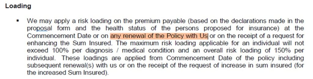 | Loading on premium as per health status of person purchasing the policy | Yes applicable, 100% per diagnosis / medical condition and an overall risk loading of 150% per individual. · In First policy, · Increase in cover limit, and · On renewal |
